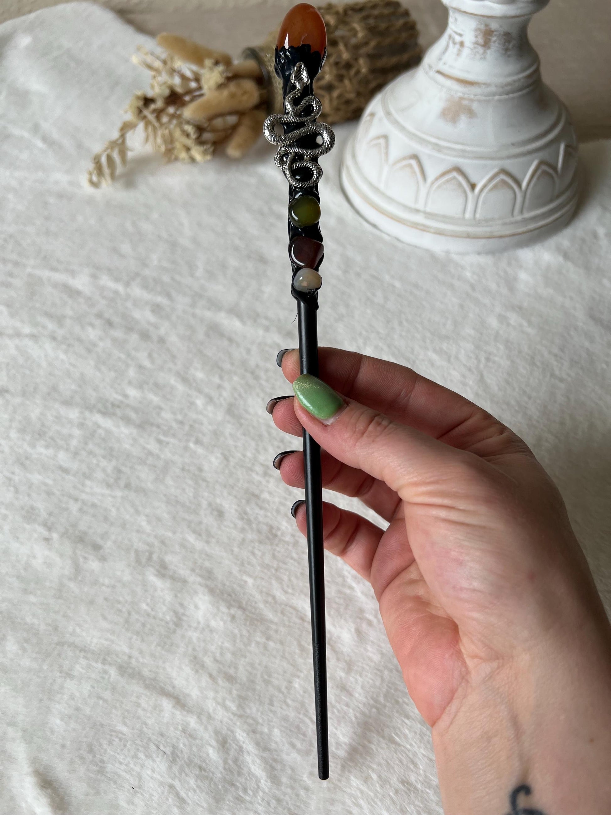 Diese handgefertigten Mini-Zauberstäbe vereinen die uralte Symbolik der Schlange mit der kraftvollen Energie des Karneols. Die Schlange steht für Transformation, Heilung und innere Kraft - sie leitet dich durch Wandel und Erneuerung.